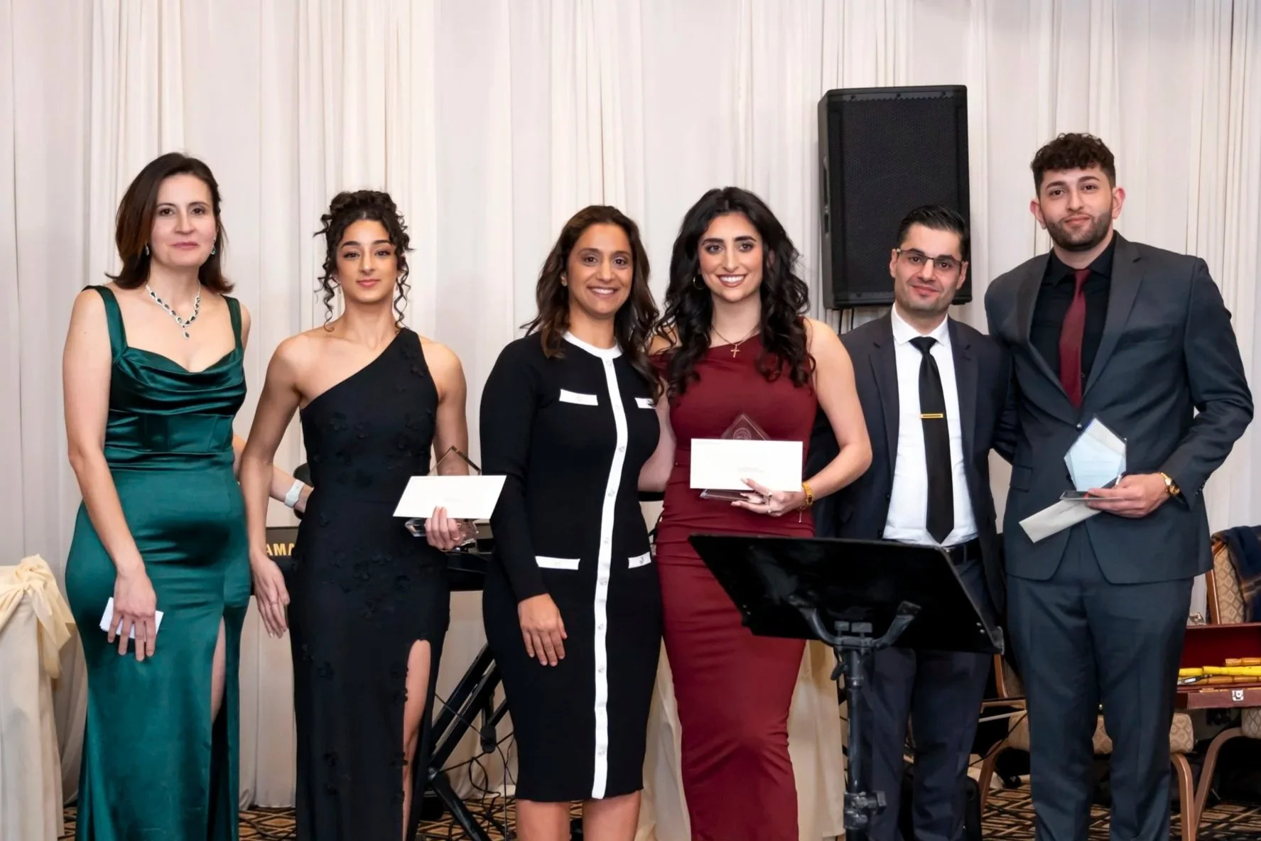 Pictured L to R at the Inaugural Winter Gala, January 25, 2025: Rana Sweis (Presenter), Yara Swaiss (Scholarship Award Recipient), Dr. Dena Akkawi-Tadros (Presenter), Jovanna Sarena (Scholarship Award Recipient), Dr. Awni K. Sweis (Presenter), and Alexander Sweis (Scholarship Award Recipient)